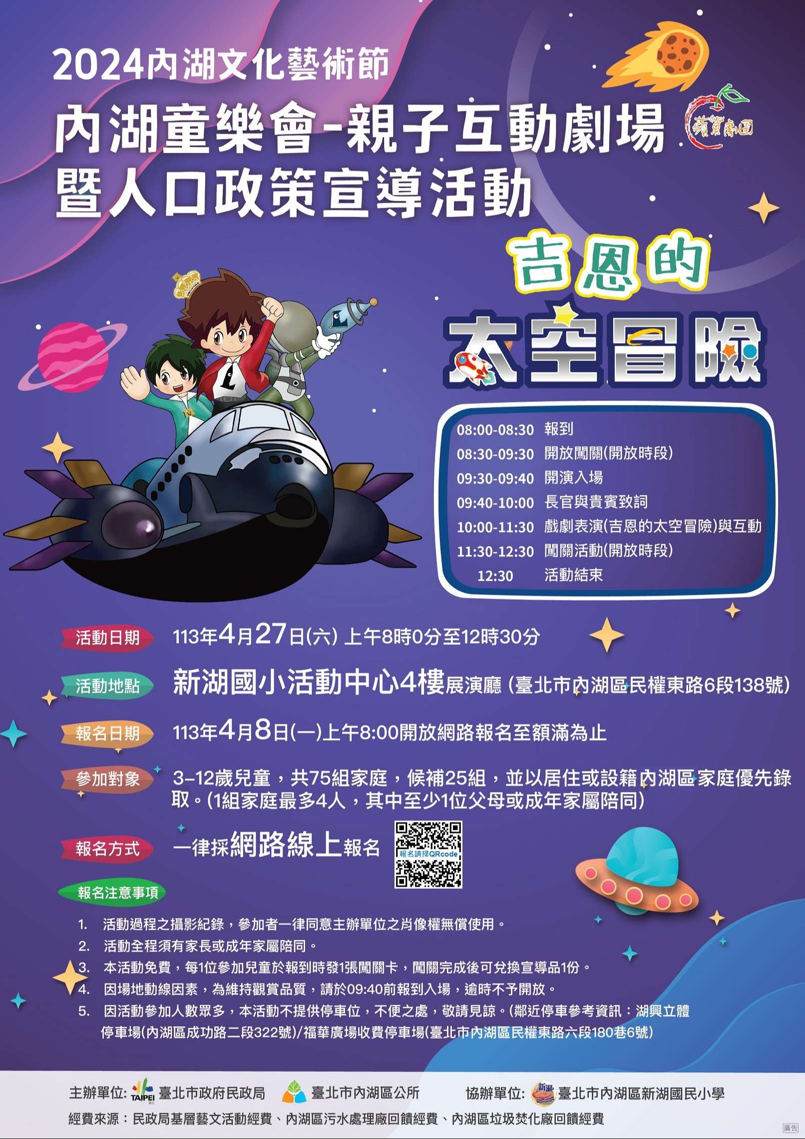 一、臺北市內湖區公所於4月27日(六) 08:00至12:30,於臺北市內湖區新湖國民小學活動中心舉 辦2024年內湖文化藝術節「內湖童樂會-親子互動劇場」暨人口政策宣導活動,