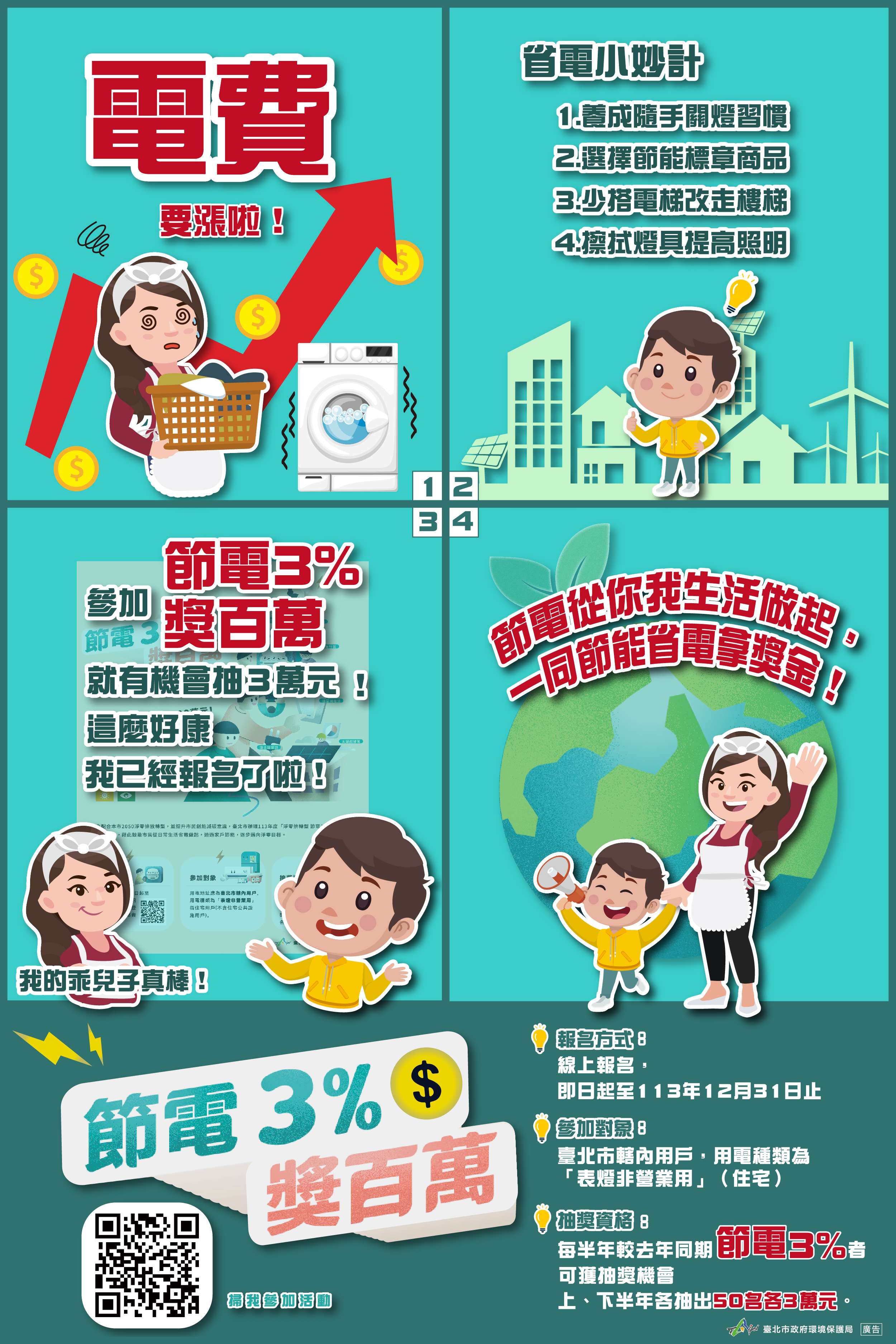 二、為鼓勵市民落實節能減碳行動,本府環境保護局於113年3 月1日推出旨揭活動,因應本市2050淨零排放及經濟部宣布 4月起調漲電價,民眾於日常生活中精進用電習慣等行動更顯重要。