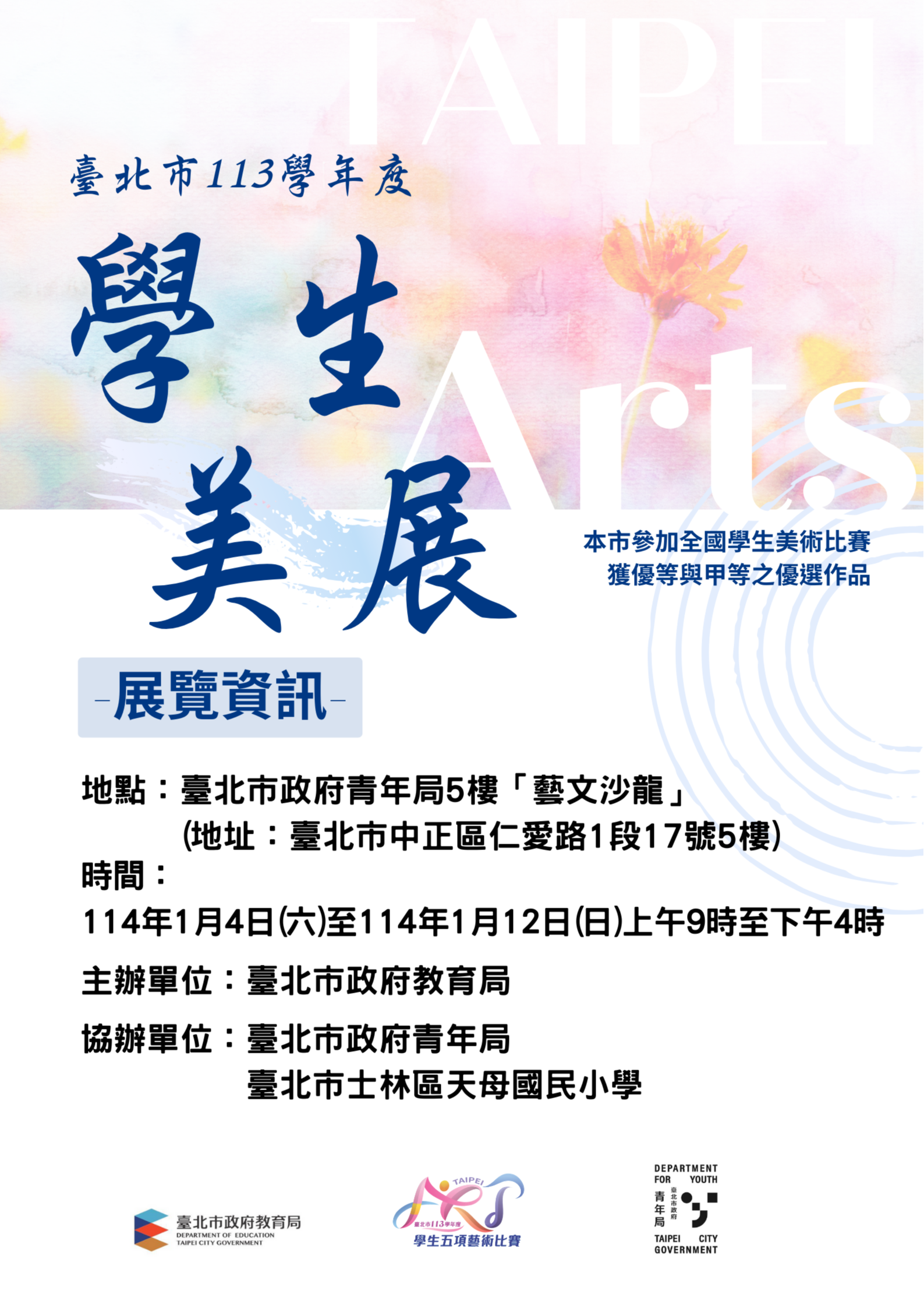 二、為提供優秀作品展示及相互交流機會,並激勵其持續發揮 創意與創作,豐富臺北詮釋,提升本市藝文之能見度及競 爭力,本局特與本府青年局共同舉辦旨揭學生美展;展覽 資訊如下