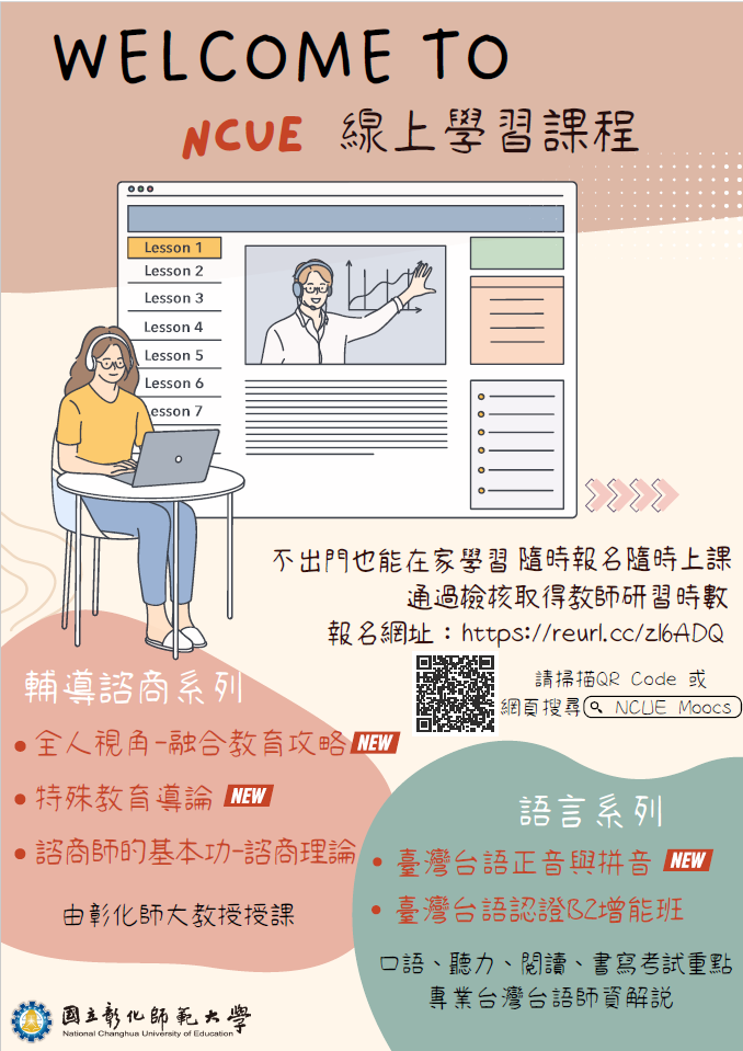 一、由該校教務處數位學習組、進修學院共同規劃線上非學分班數位學習課程,學員依規定完成線上數位課程後,將頒 發國立彰化師範大學「精緻Moocs 系列課程研習證書」,若具有教師資格本校會自動在全國教師在職進修網登錄研習時數。