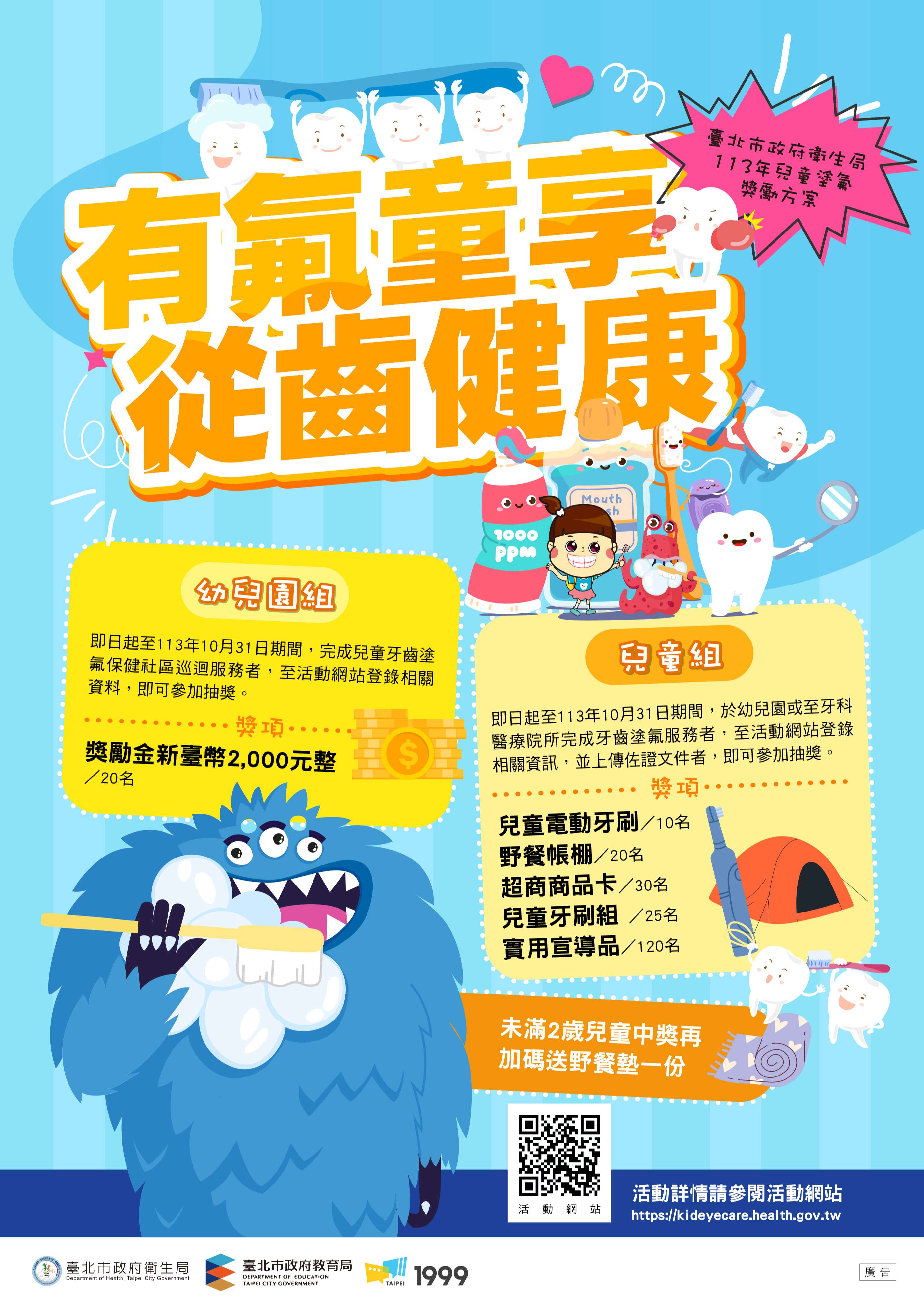 (二)好牙寶寶組(幼兒):即日起至113年10月31日期間,於兒童牙齒塗氟保健社區巡迴服務場次或由家長安排自行前 往牙科院所完成牙齒塗氟服務並於活動網站登錄者,即 符合抽獎資格。