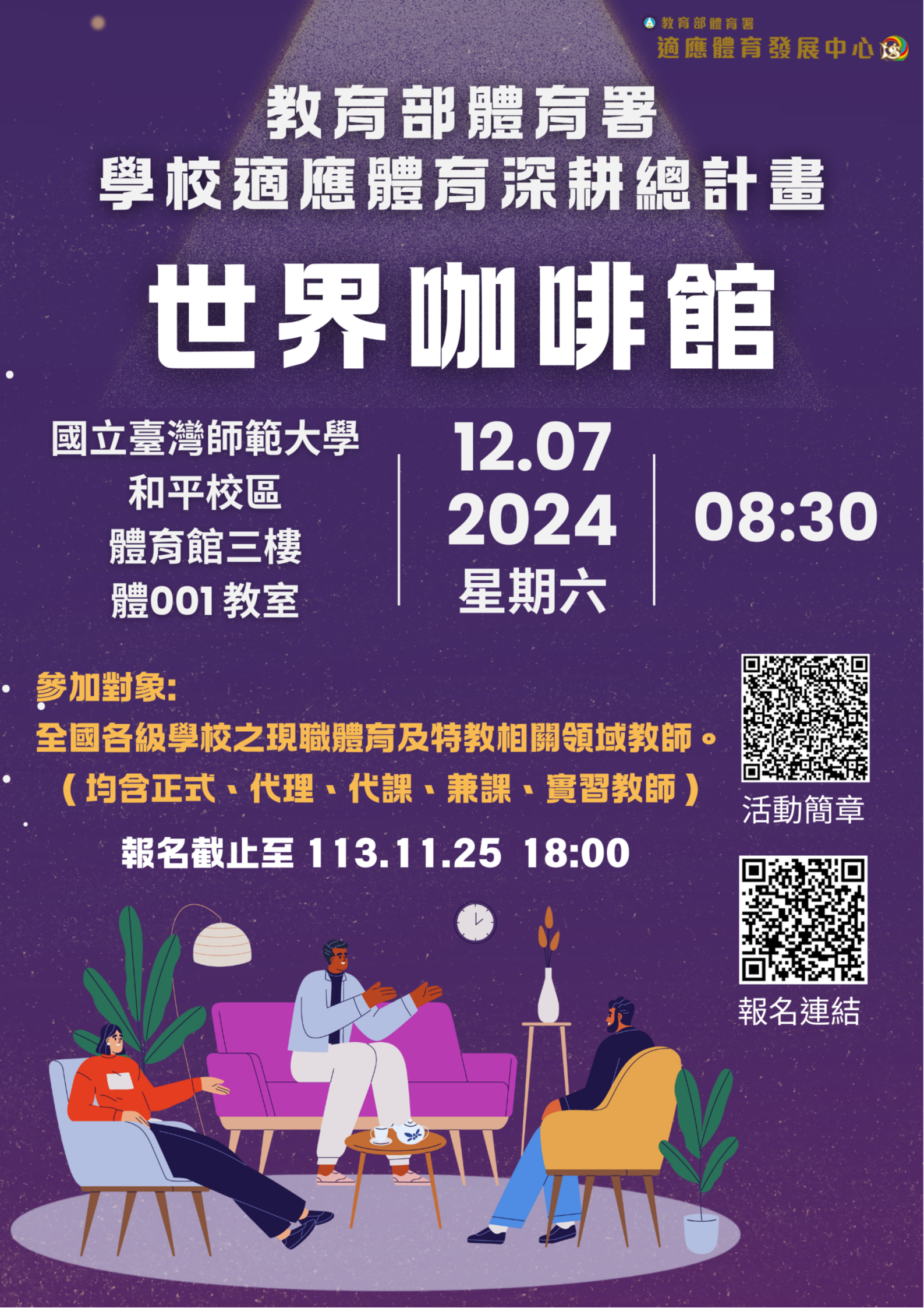 (三)活動地點:國立臺灣師範大學和平校區I體育館3樓體 001教室(臺北市大安區和平東路一段162號)。