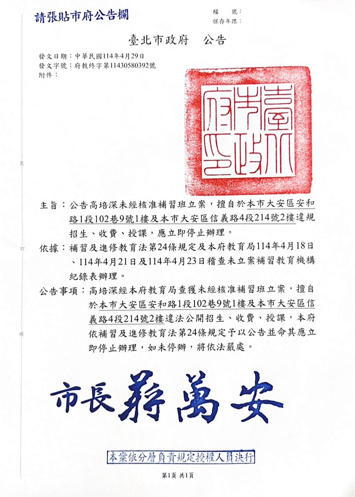 二、高培深經本局查獲未經核准補習班立案,擅自於本市大安 區安和路1段102巷9號1樓及本市大安區信義路4段214號2樓 違法招生收費、授課,經本局依補習及進修教育法第24條 規定