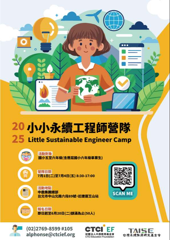 二、活動資訊摘要: 報名資訊:即日起至114年6月20日(五)止(50人為限,額滿即止),僅接受網路報名,敬請進入活動報名網頁 (https://reurl.cc/Z4vlEp) 報名資格:114學年度國小五、六年級生(含應屆畢業生)。活動時間:2025年7月1日(二)至7月4日(五) (不過夜營隊)。 敬請持續關注本會臉書粉絲專頁(https://www.facebook.com/CTCIEF/ ) 及官網掌握活動消息。 活動洽詢:中鼎教育基金會 林經理,電話:(02)2769-8599 轉105。信箱:alphonse@ctcief.org。