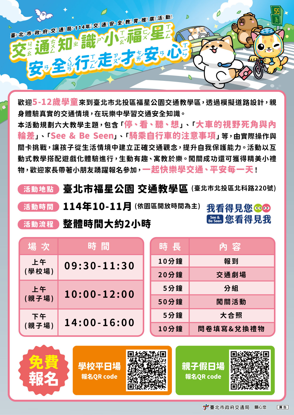 二、為增進兒童交通安全知能,透過辦理交通公園推廣活動, 引導兒童正確學習穿越路口及避開視野死角等技巧,以提 升自我保護能力,降低交通事故發生風險,本府交通局於 今(114)年10月將新增啟用第二座交通公園交通教學區 (實際啟用日期依交通局通知為主),位置於臺北市福星 公園(臺北市北投區北科路220號)。該局委託雷科斯國際 有限公司於該教學區辦理「114年交通安全教育推廣活 動」,訂於114年9月至11月間舉行,內容如下: