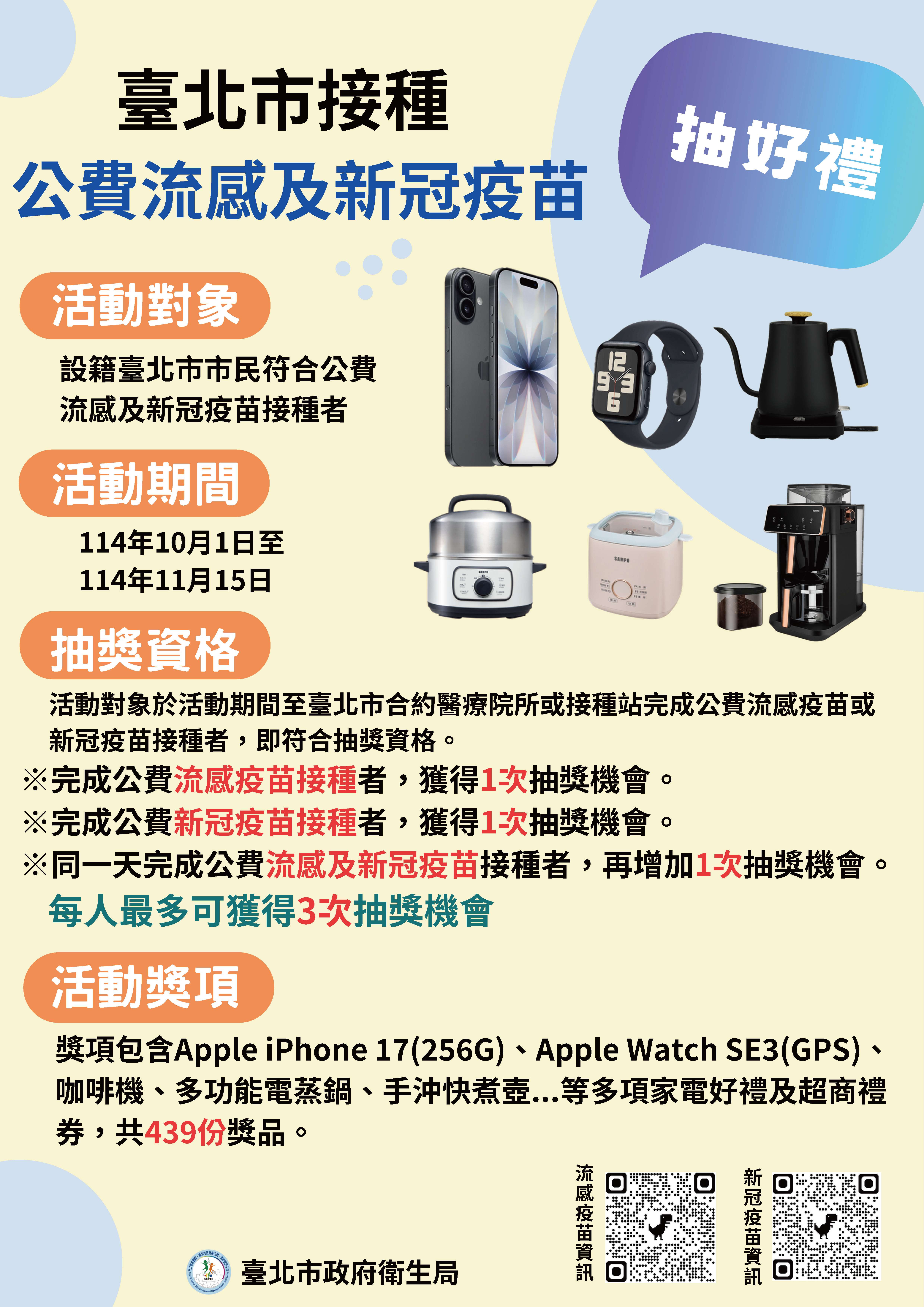 三、為提升本市民眾流感及新冠疫苗接種意願, 旨揭抽獎活動 期間延長至114年11月30日,並增辦第3次抽獎,活動內容 摘述如下: