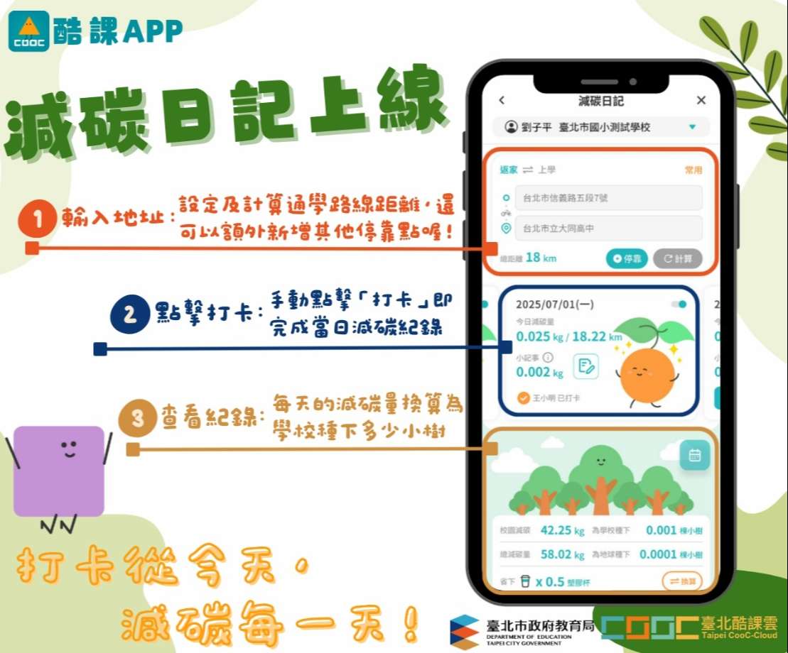 (一)為形塑學生淨零綠生活習慣,本局訂有「臺北市國民小學低碳上學推動計畫」,並自114學年度起結合「減碳日記(酷課APP功能模組)」,擴大推動低碳上學計畫至高級中等學校暨國民中學,鼓勵學生以步行、大眾運輸或低碳運具通勤,從日常行動落實減碳。