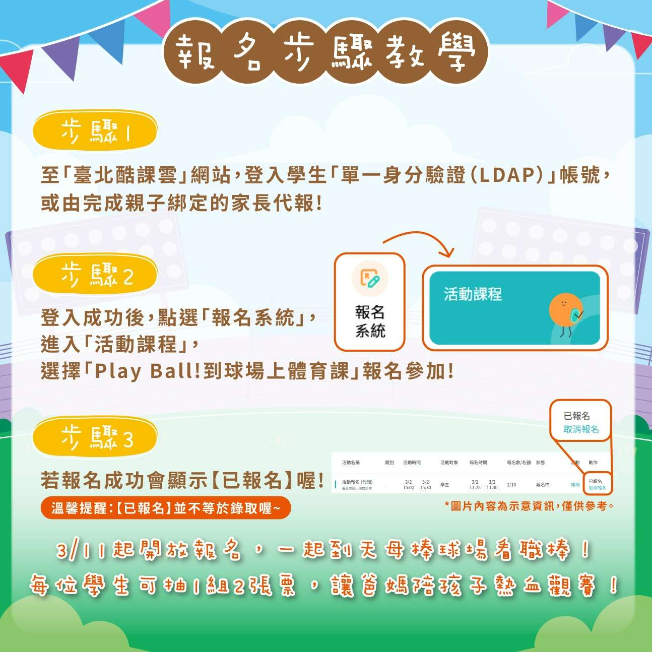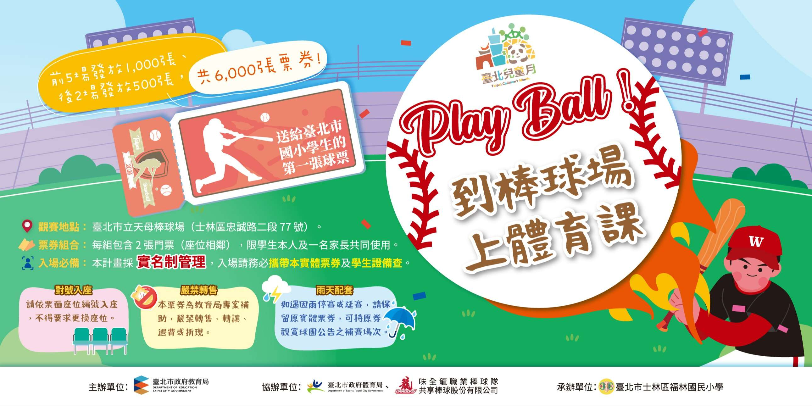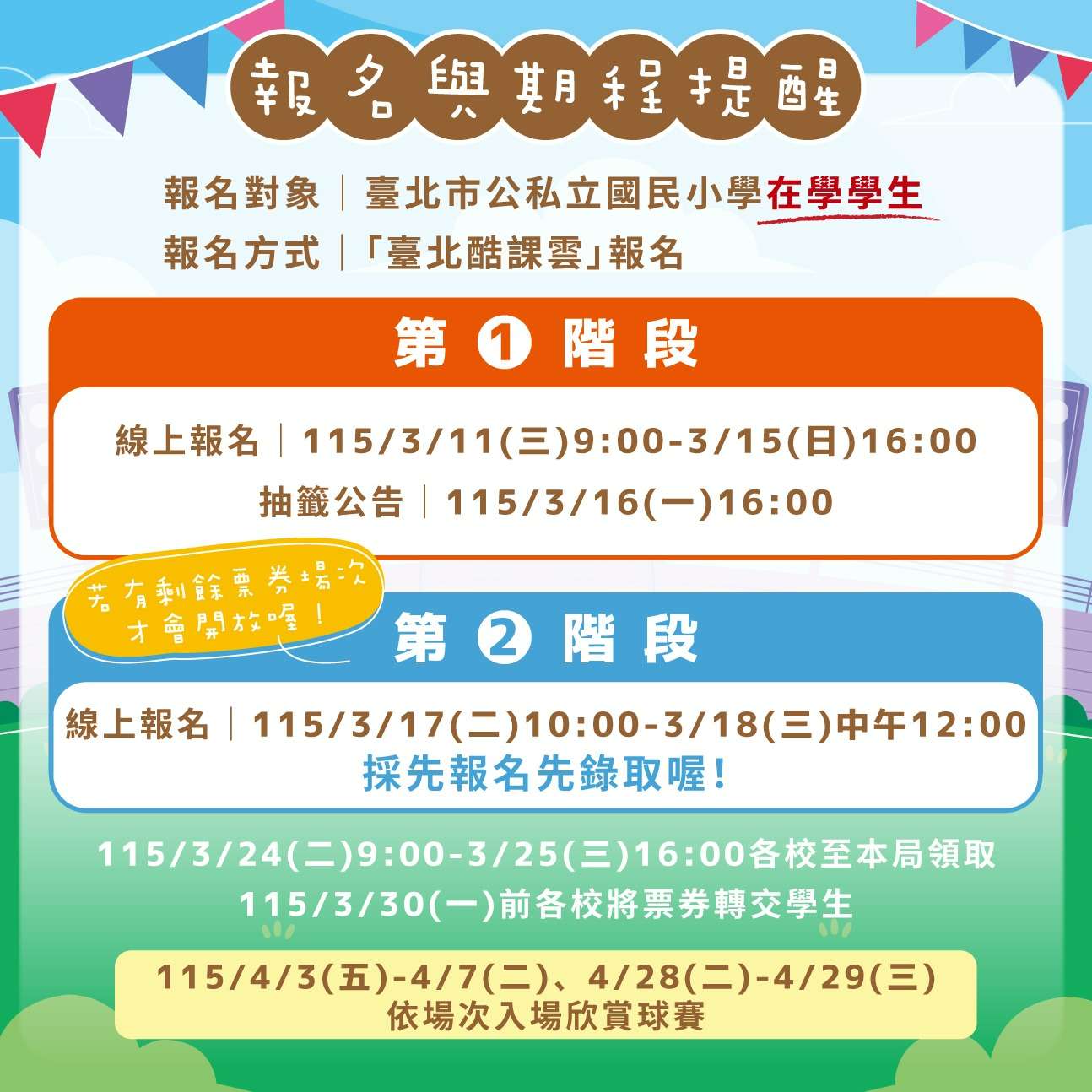 (二)場次:115年4月3日至4月7日、4月28日及4月29日,共計 7場次,地點為臺北市立天母棒球場。